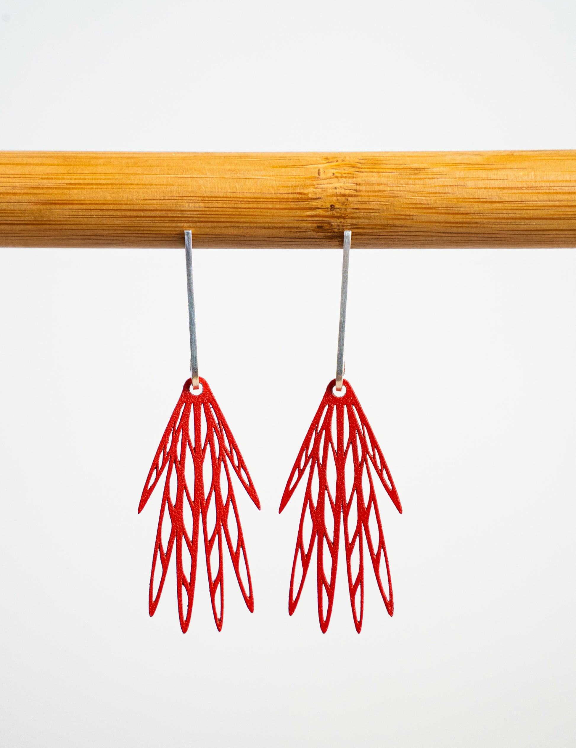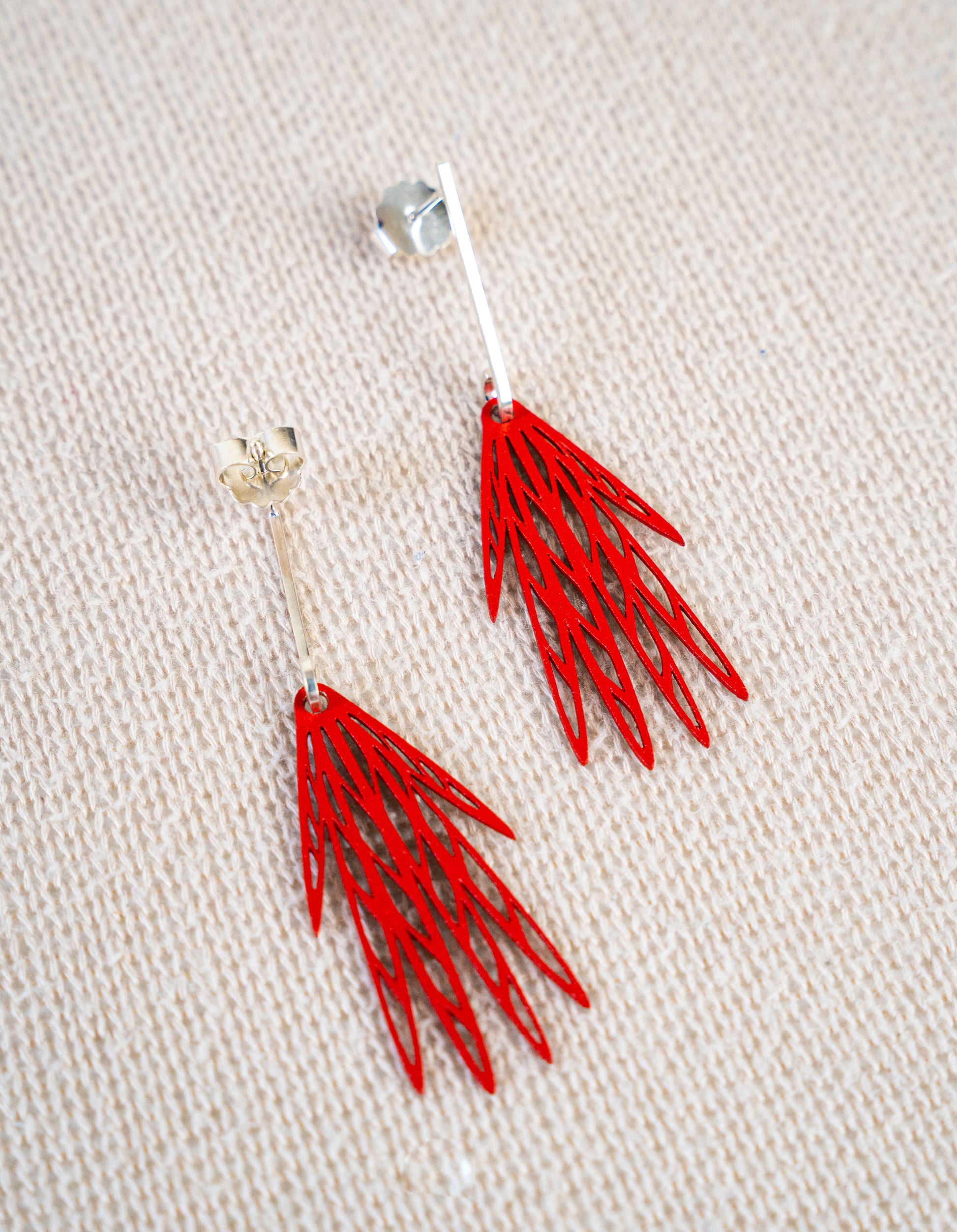 Los aretes Alma Roja representan la pasión y la fuerza vital con dos rombos tejidos en mostacilla miyuki en tonos rojo coral, atravesados por una línea dorada que simboliza la energía del sol. Ensamblados en plata reciclada, evocan la unión entre la tierra y el espíritu.